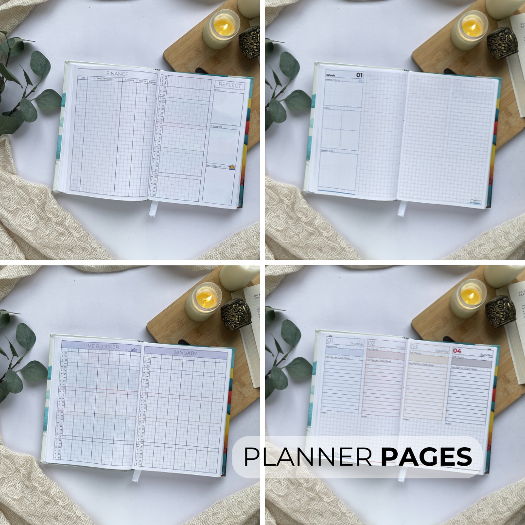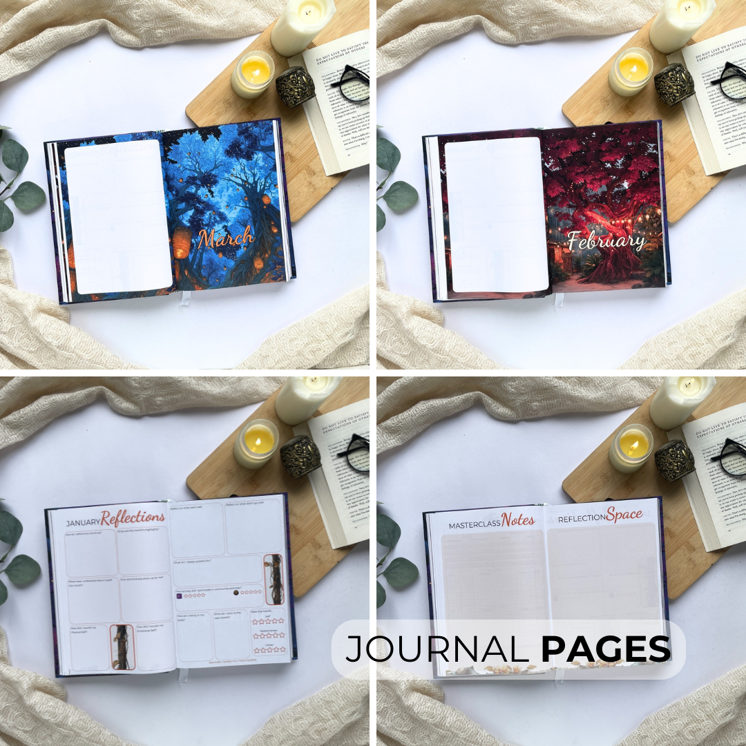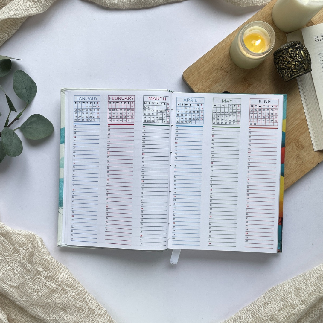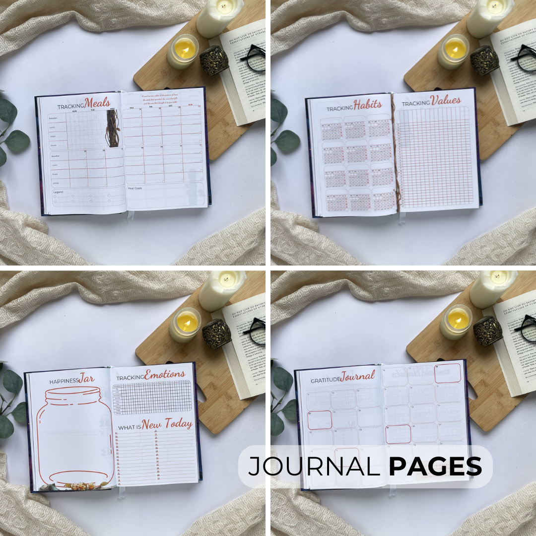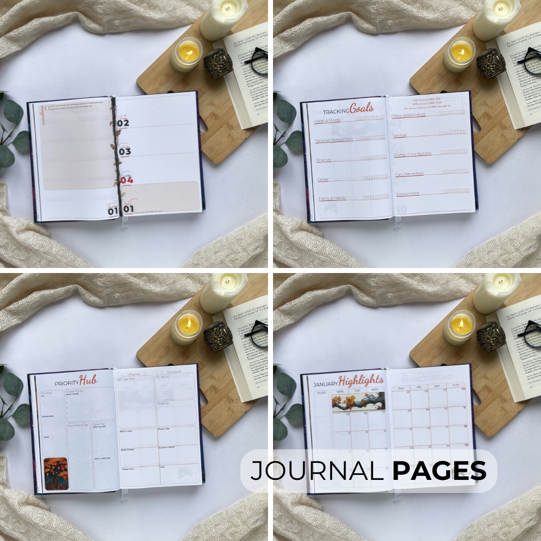 - Year beginning pages: Letter from the Universe, Letter to Yourself, I AM, Roots that Hold Me, Gratitude, Calendar 2026, Vision Board, Level 10 Goals, Bucket List, Travel Vision, My Celebrations, My Birthday, Borrow & Lend, My Passwords, My Skills, Medicines, Vaccines, and Allergies, Books, Screens & Streams, Amazing People, Walls and Boundaries, My Communities, Happy Proud Moments, Blank Spaces, Year in Days, Year in Months